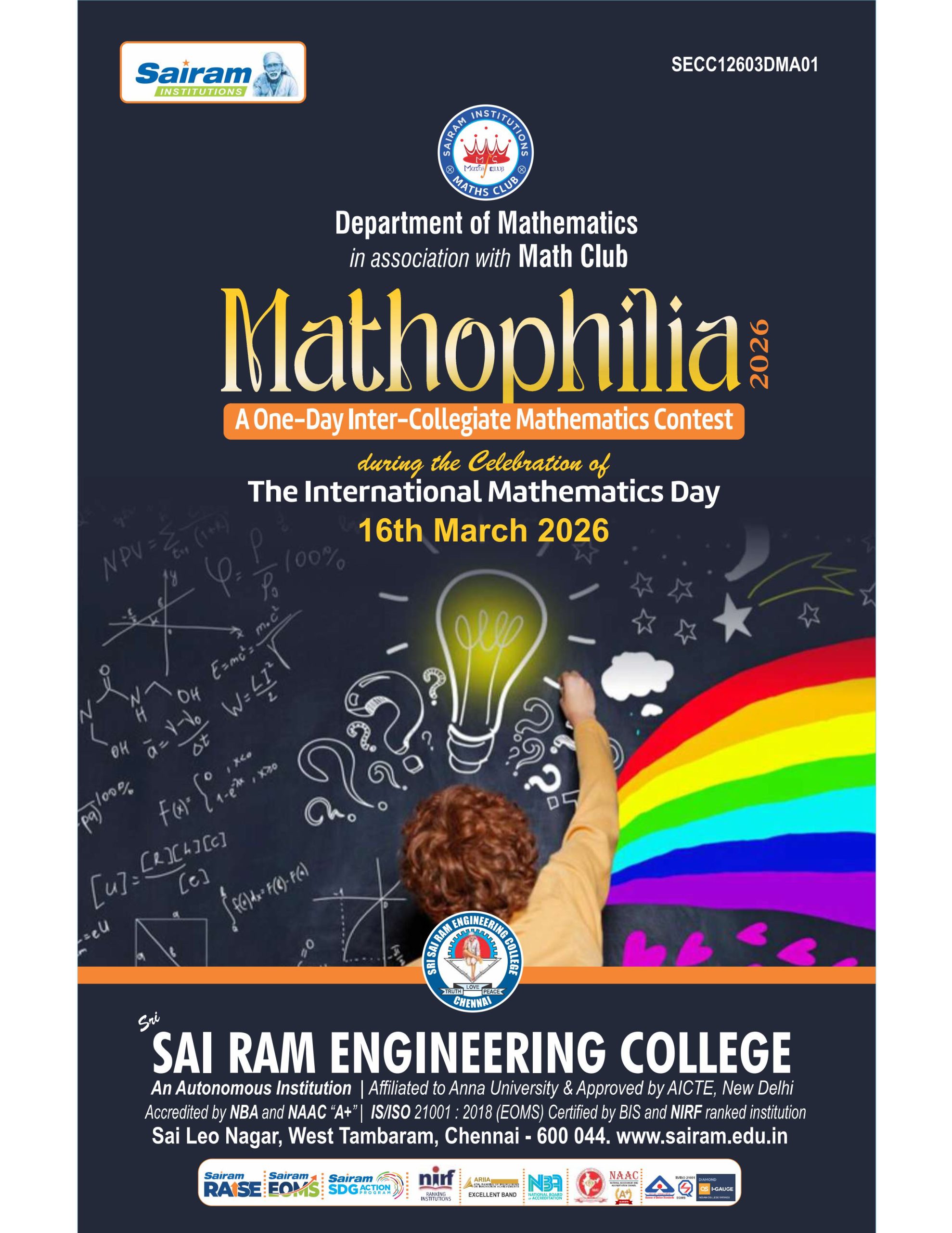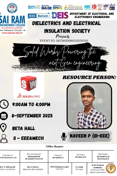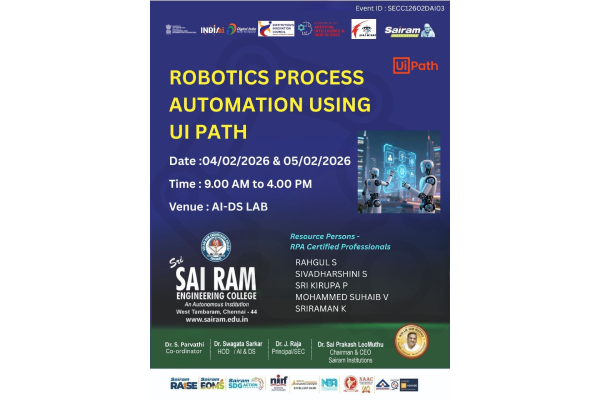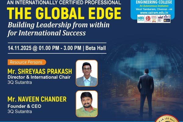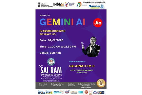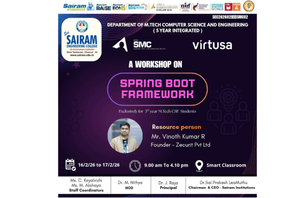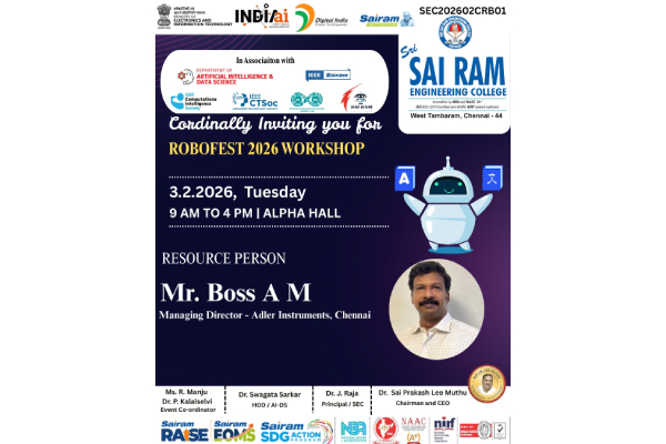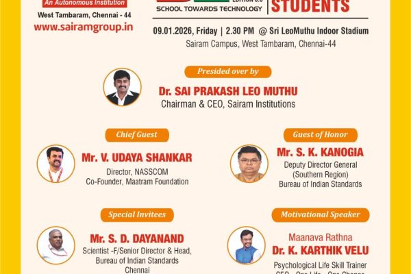 Sri Sairam Engineering College, Chennai, established in the year 1995 by MJF.Ln.Leo Muthu, Chairman of Sapthagiri Educational Trust, is a non-profitable and a non-minority institution. A well-defined vision, highly committed mission and a dedicated leadership facilitate Sri Sairam Engineering College to be in the best of educational institutions in the country. Since its inception, the institution has grown into a vast conglomerate of magnificent buildings, state-of-the art laboratories, sophisticated internet centres, modern digital library block and a superlative sports complex, each a land mark in itself across 300 acres. The institution is situated in a sprawling campus with architecturally and aesthetically designed buildings, blocks, stadiums, auditoriums, hostels, gymnasium and the sports grounds.