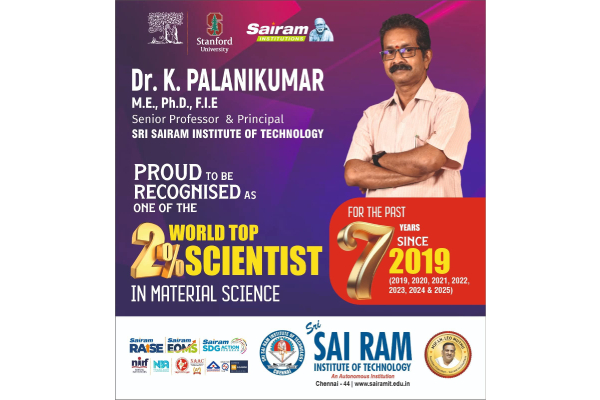 Heartfelt congratulations to Dr. K. Palanikumar, Principal, Sri Sairam Institute of Technology, for his remarkable achievements that continue to elevate Sairam’s global reputation!