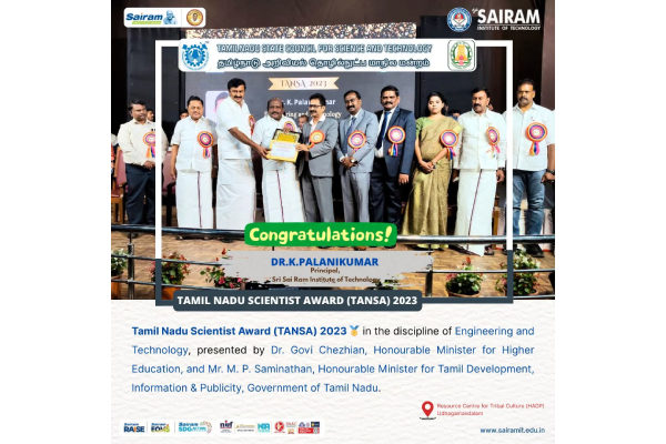 Honoured with the Tamil Nadu Scientist Award (TANSA 2023) in Engineering and Technology, by the Tamil Nadu State Council for Science and Technology.