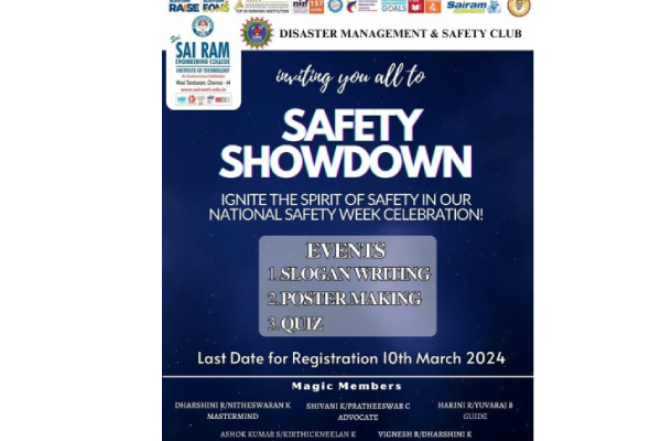 On 10.03.2024, the Disaster Management and Safety (DMS) Club organized events in celebration of the 53rd National Safety Week. Various activities such as slogan writing, poster making, and a quiz were conducted to promote safety awareness among students. The program emphasized the importance of personal and public safety through engaging and educational activities. Students actively participated and showcased their understanding of safety practices. The event successfully created awareness and reinforced the importance of safety as a priority.
