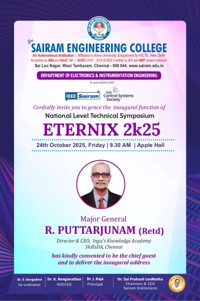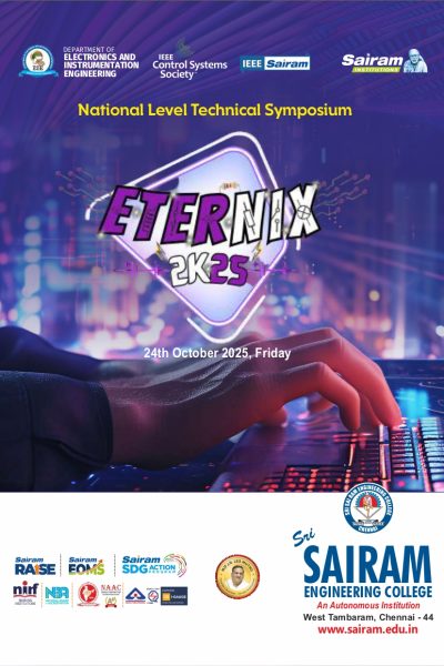 The Department of Electronics and Instrumentation Engineering, Sri Sairam Engineering College, in association with IEEE Sairam and IEEE Control Systems Society, proudly organized ETERNIX 2K25, a National Level Technical Symposium, on 24th October 2025 at Apple Hall.