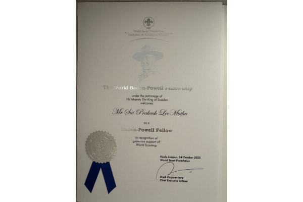 The prestigious recognition, presented on 24th October 2025 at Kuala Lumpur, celebrates his visionary leadership and unwavering support for global youth development through the principles of service, discipline, and compassion — the very ideals upon which the Scouting movement stands.