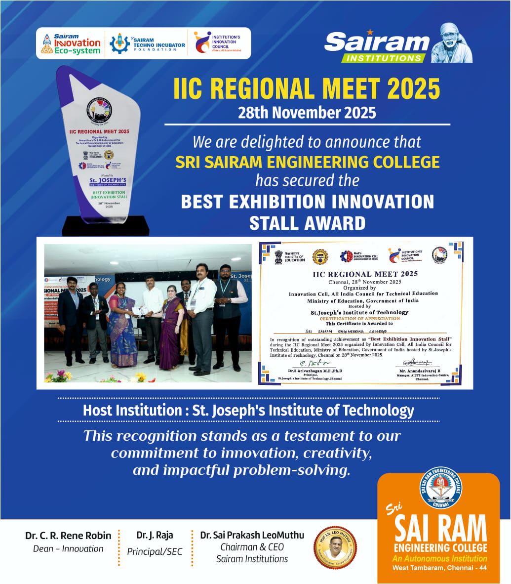 We are delighted to share that Sri Sairam Engineering College has secured the Best Exhibition Innovation Stall Award at the IIC Regional Meet 2025, held on 28th November 2025 at St. Joseph’s Institute of Technology.