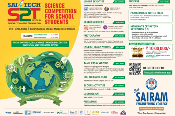 As part of SAI TECH S2T Edition 6.0, the Photography Club of Sri Sairam Engineering College successfully conducted the Photography Event under the theme “Peace and Community Engagement.” The event was organized to encourage school students to express social harmony, unity, and community responsibility through creative photography.