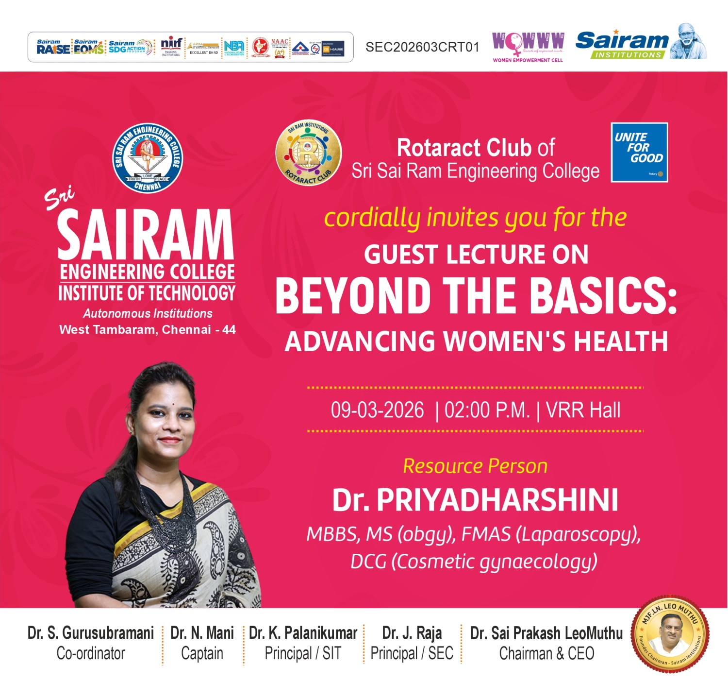 The Rotaract Club of Sri Sairam Engineering College organized an insightful Health Awareness Session on 9th March 2026 at VRR Hall. The session was led by Dr. Priyadharshini (MBBS, MS (OBG), FMAS), a renowned expert in obstetrics, gynecology, and cosmetic laparoscopy.