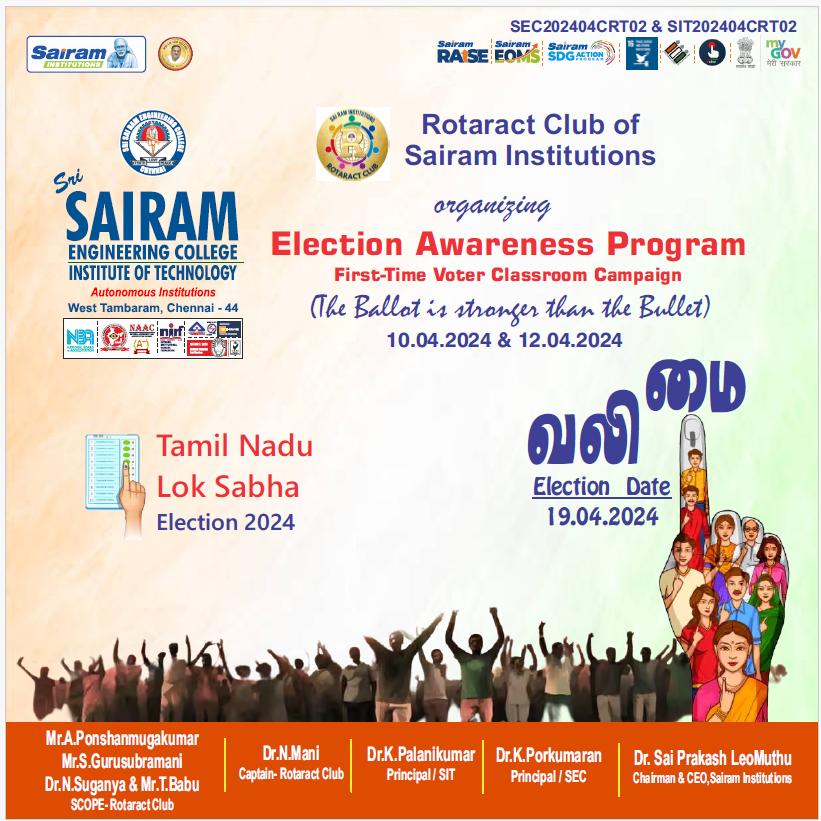 The Rotaract Club of Sairam Institutions successfully organized an Election Awareness Program as part of a First-Time Voter Classroom Campaign on 10th and 12th April 2024. Centered around the theme “The Ballot is stronger than the Bullet,” the initiative aimed to educate and inspire young voters about the importance of participating in the democratic process.