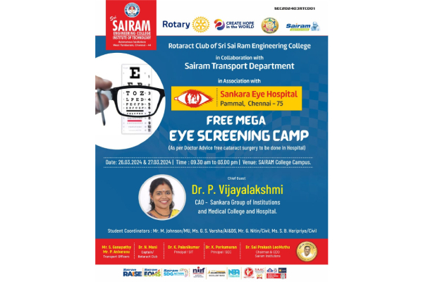 The Rotaract Club of Sri Sairam Engineering College, in collaboration with the Sairam Transport Department and in association with Sankara Eye Hospital, Pammal, successfully organized a Free Mega Eye Screening Camp on 26th and 27th March 2024 at the college campus.