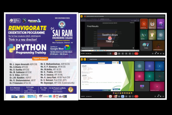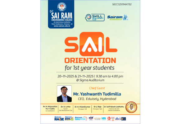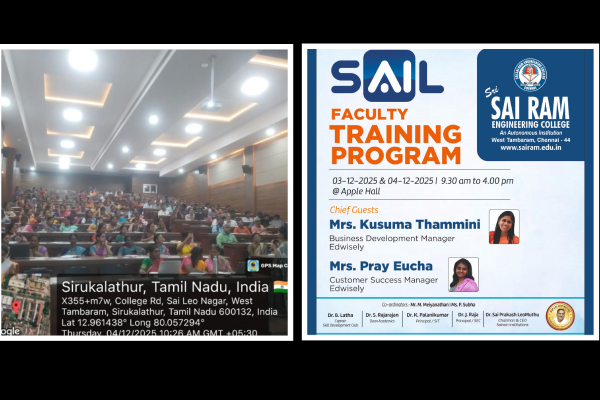 The SAIL Faculty Training Program was successfully conducted by the Skill Development Club, Sairam Institutions, in association with Sairam Engineering College, Chennai. The program aimed at enhancing faculty competencies in skill development, industry-aligned practices, and modern pedagogical approaches, thereby strengthening teaching effectiveness and employability-oriented education. The training program was organized over two days, on 03rd and 04th December 2025, at Apple Hall, Sairam Engineering College.