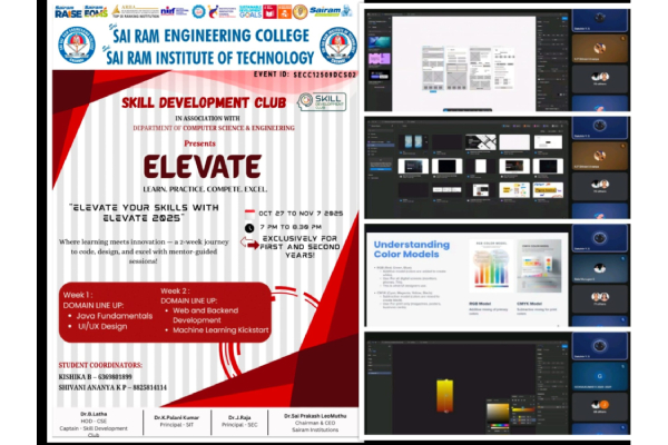 ELEVATE 2025 was a two-week skill development program organized by the Skill Development Club, in association with the Department of Computer Science & Engineering at Sri Sairam Engineering College and Sri Sairam Institute of Technology. The event was conducted from October 27 to November 7, 2025, exclusively for first- and second-year students, with mentor-guided sessions held in the evenings. The program focused on enhancing technical and creative skills through structured domain sessions, including Java Fundamentals and UI/UX Design in Week 1, followed by Web and Backend Development and a Machine Learning Kickstart in Week 2, with the aim of helping students learn, practice, compete, and excel.