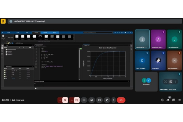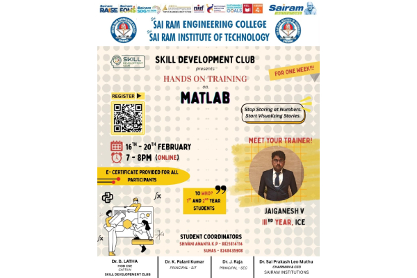 The primary objective of the Hands-on Training on MATLAB organized by the Skill Development Club was to provide foundational and practical exposure to MATLAB for first- and second-year students. The event aimed to bridge the gap between theoretical mathematics and real-time computational applications by introducing participants to data visualization, matrix operations, basic programming concepts, and problem-solving using MATLAB.