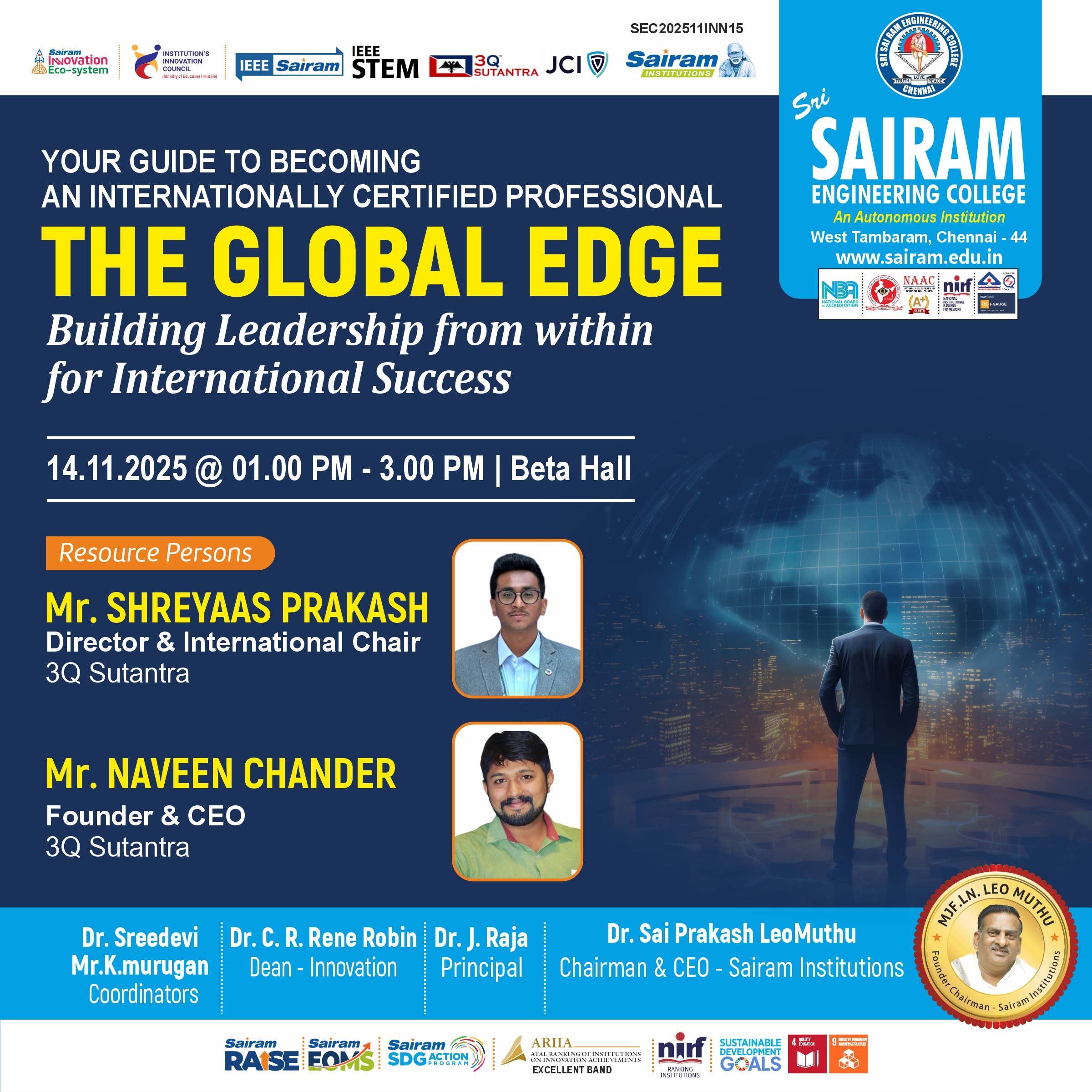 Sri Sairam Engineering College is all set to host “The Global Edge – Your Guide to Becoming an Internationally Certified Professional” tomorrow, 14th November 2025, at Beta Hall.
